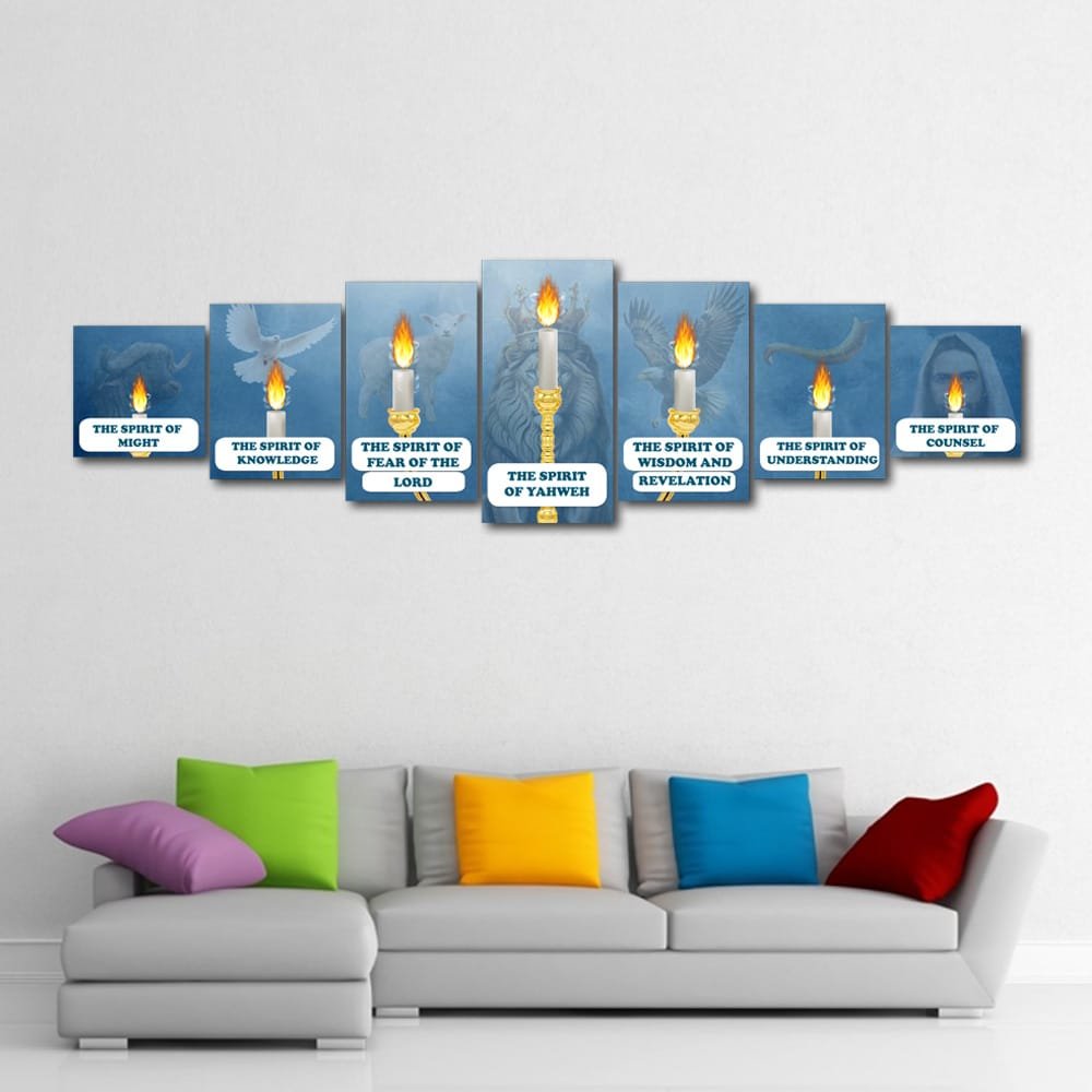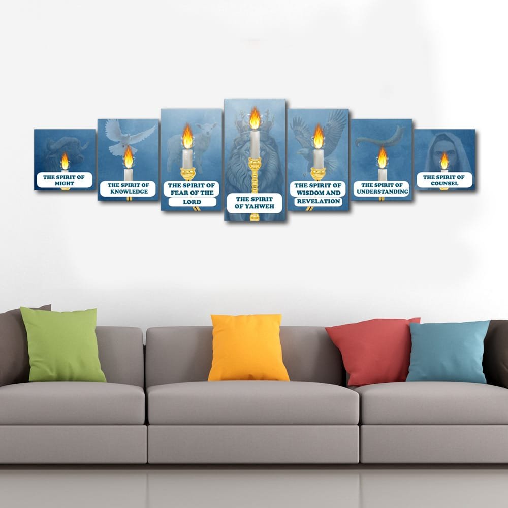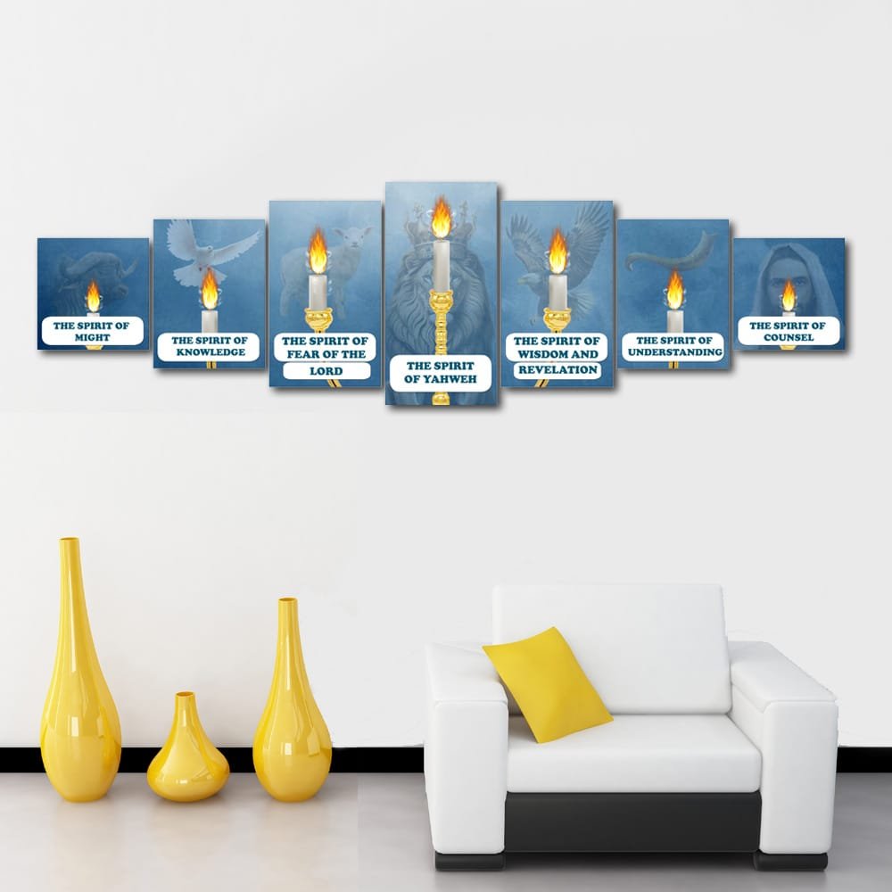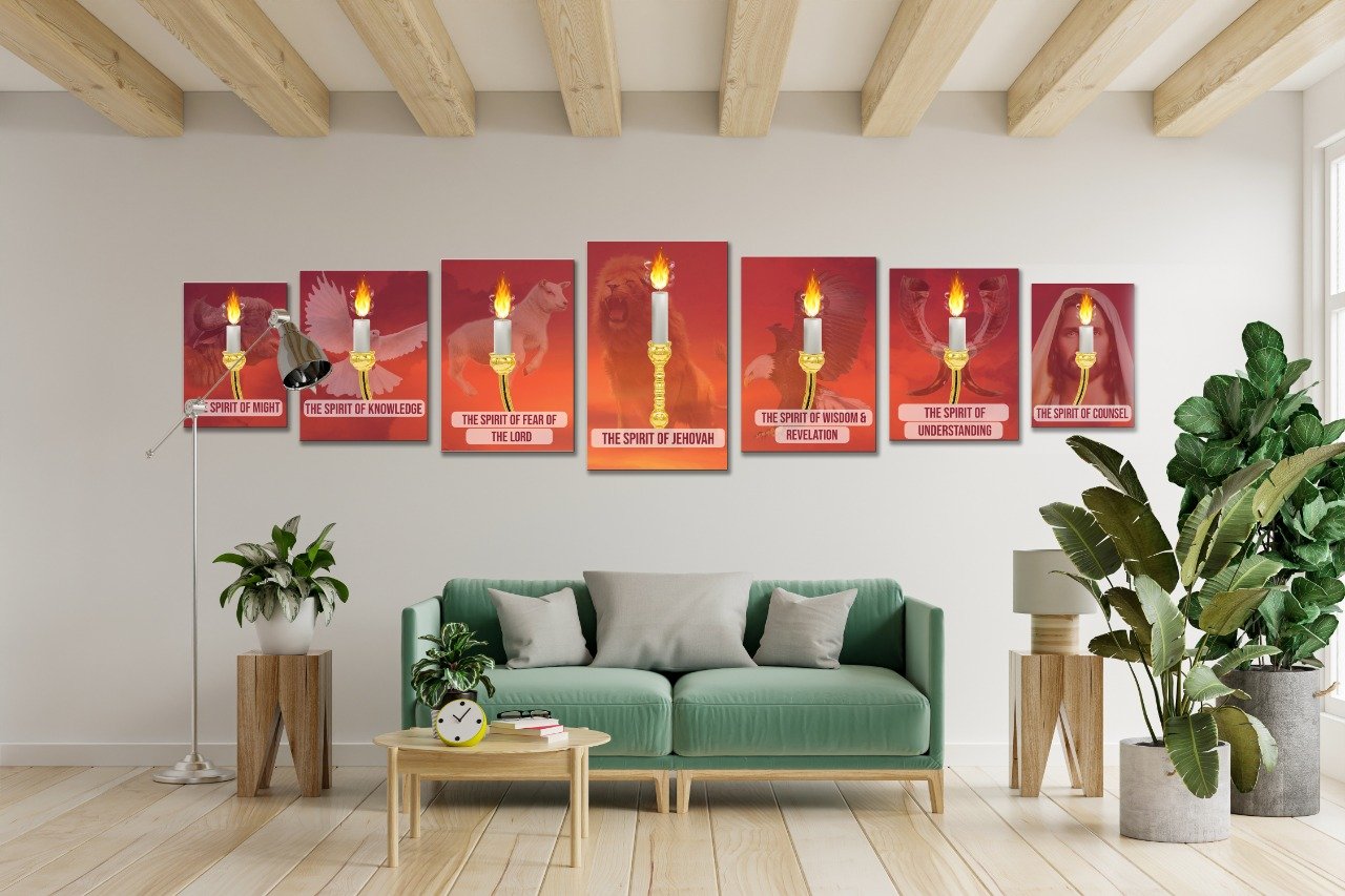 Transform your wall into a sacred narrative with this unique artwork: seven individual panels that, when arranged together, form the complete image of the biblical lampstand with seven flames—each representing one of the Seven Spirits of God sent out into all the earth, as described in the books of Isaiah and Revelation.